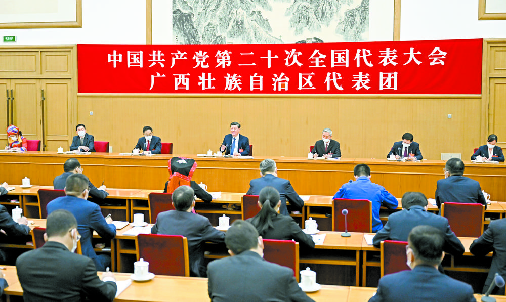 广西代表团刘宁、蓝天立、周家斌、祝雪兰、郑志明等5位代表结合实际对报告发表了意见,分别就奋力谱写中国式现代化广西篇章、铸牢中华民族共同体意识、保护好桂林山水、发展特色农业产业、不断深化自主创新等问题发言。大家认为,党的二十大报告站在民族复兴和百年变局的制高点,科学谋划未来5年乃至更长时期党和国家事业发展的目标任务和大政方针,提出一系列新思路、新战略、新举措,是指导我们全面建设社会主义现代化国家、向第二个百年奋斗目标进军的纲领性文献,一致表示拥护这个报告。