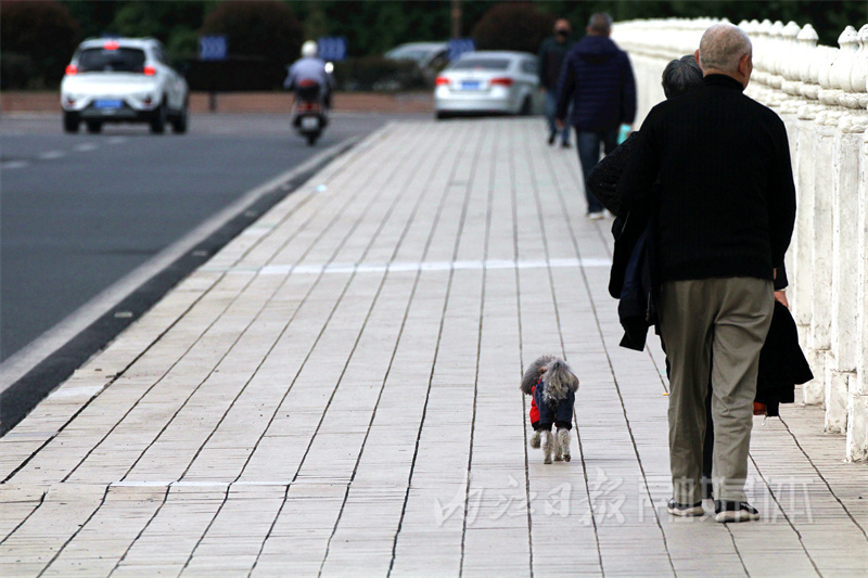 10月30日下午,记者在桐梓坝大桥上看到,正在大桥上行走的两名行人身旁带着一只小狗,大桥上车来车往,小狗并未栓绳,在大桥人行道上跑来跑去。