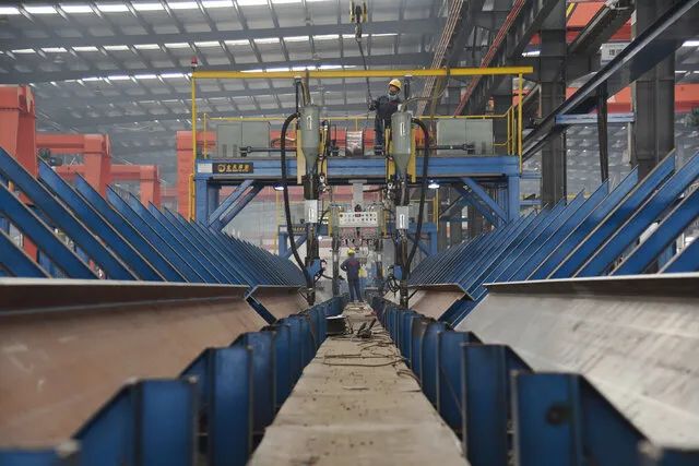 1月30日上午,在内江高新区白马园区内,四川绿建杭萧钢构有限公司厂区已是一派热火朝天的忙碌景象。生产车间内,各类机械轰隆作响,归岗的员工们紧张有序地进行着切割、埋弧焊、铆焊、焊接清理、抛丸喷涂等工序。