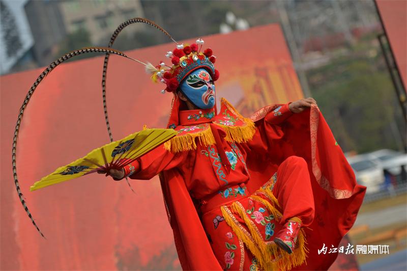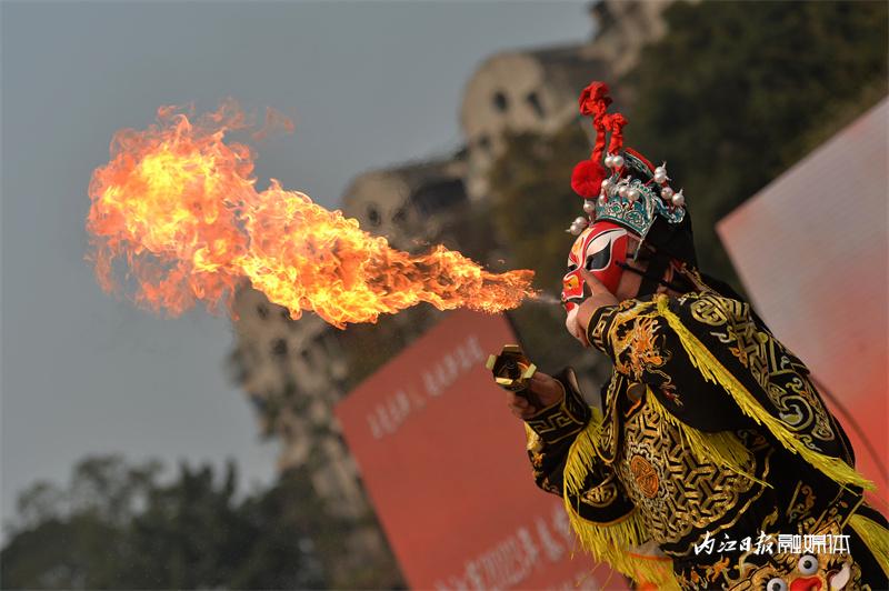 ▲2月1日,内江市2023年春节文化惠民系列活动在吾悦广场举办,图为演员表演川剧《吐火》。
