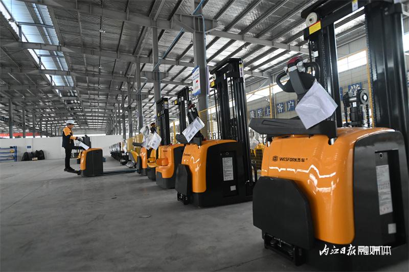 ▲2月2日,内江经开区,四川集世迈物流装备有限责任公司的工人在车间内驾驶新能源叉车。