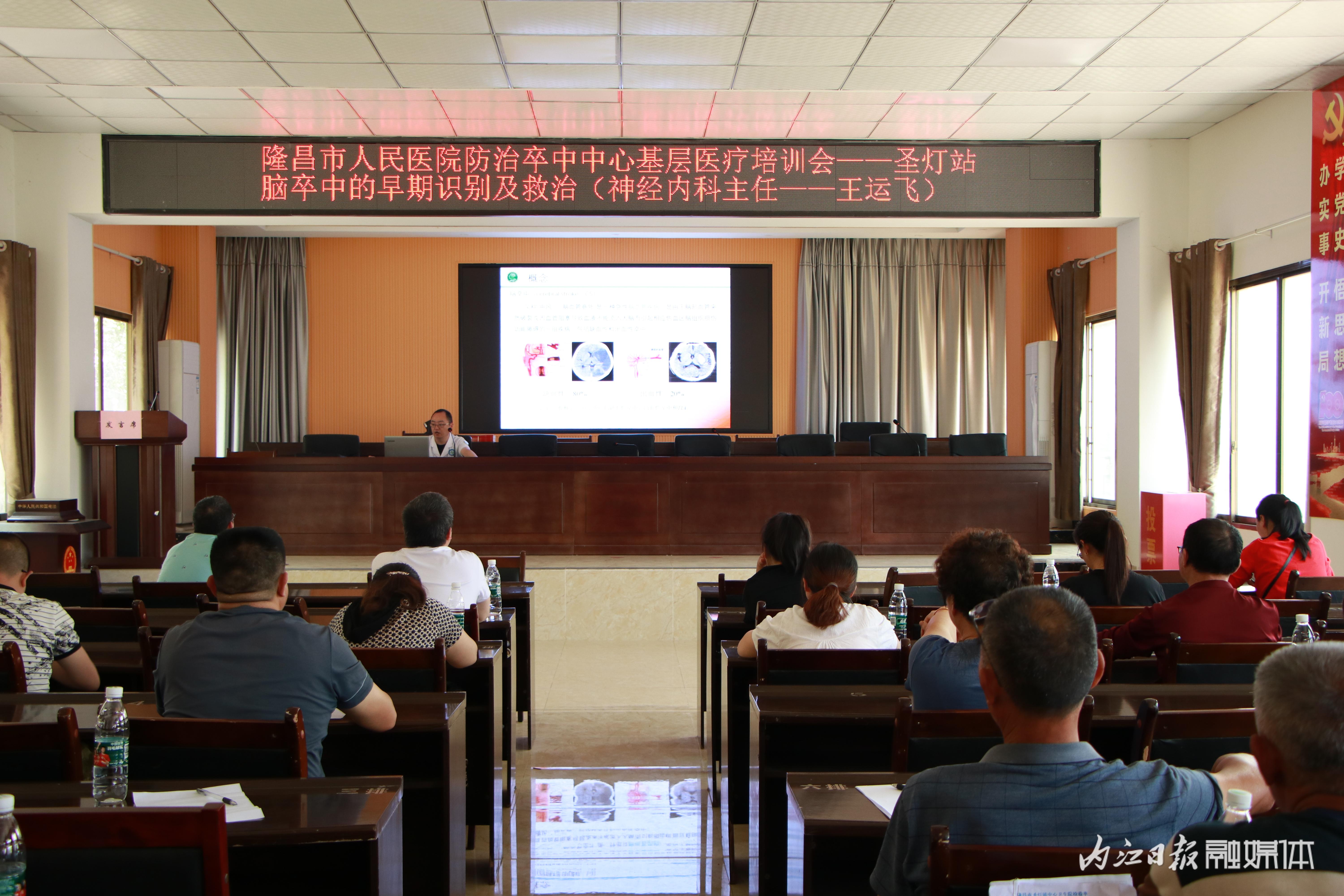 培训会上,隆昌市人民医院神经内科主任王运飞以“脑卒中的早期识别及救治”为主题,结合多年临床经验,通过PPT,用通俗易懂的语言,详细讲解了脑卒中的早期鉴别措施、治疗方法、注意事项等,并结合实例进行剖析,加深参训人员印象,切实提升大家的专业技能以及对脑卒中疾病的应急处置能力。
