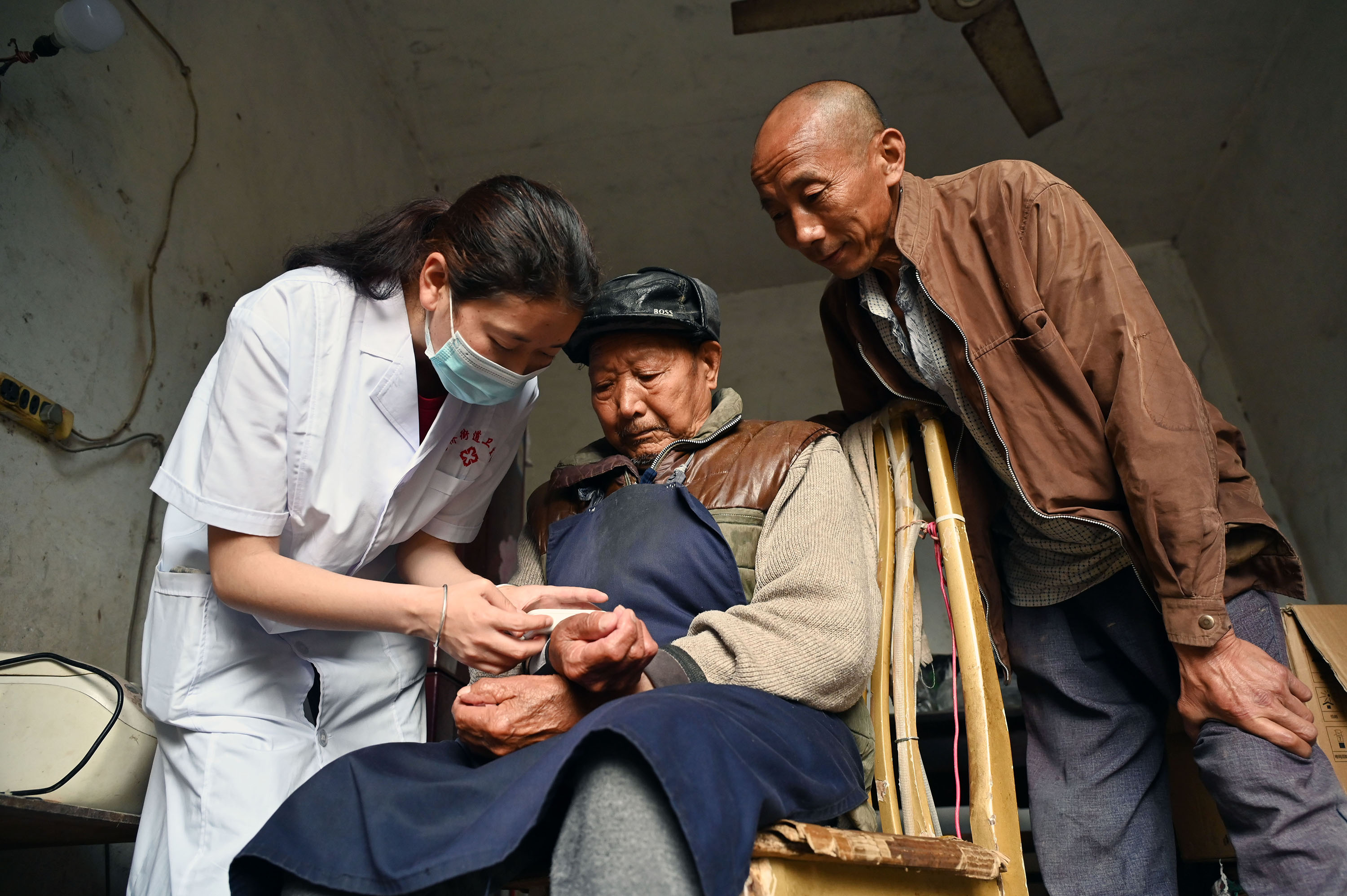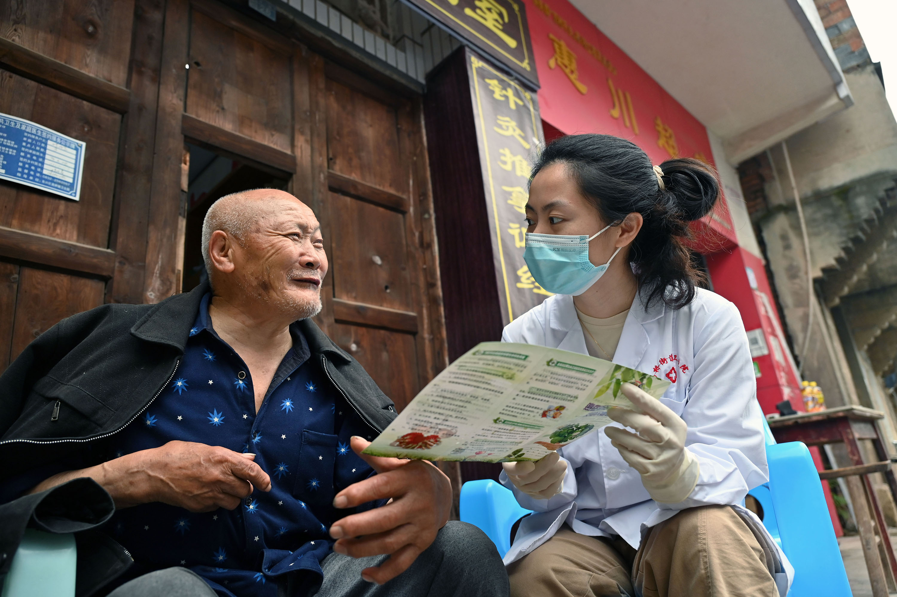 4月20日,在内江高新区高桥街道楠桥村,家庭医生走村串户为留守老人送健康。