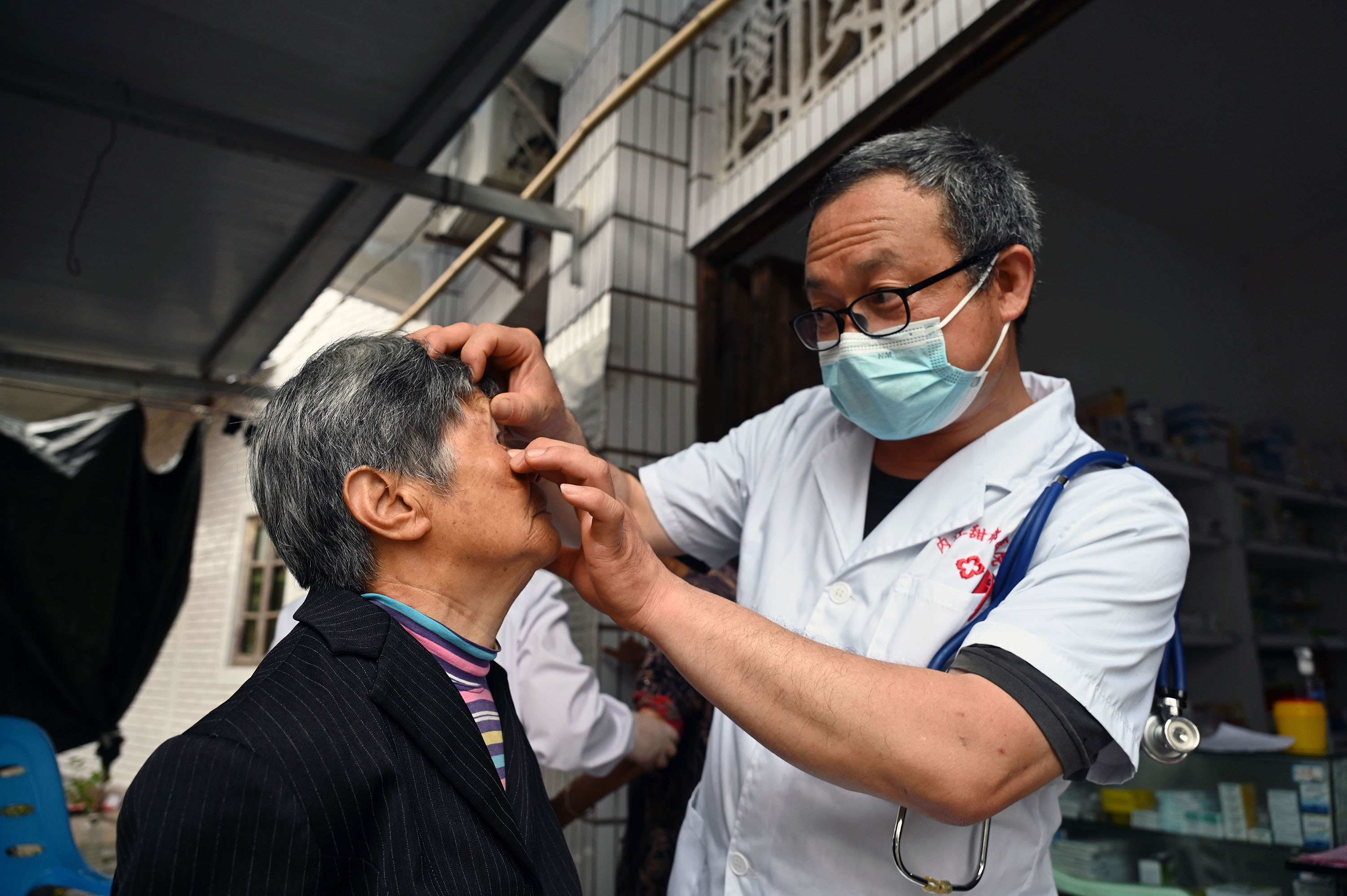 4月20日,家庭医生在内江高新区高桥街道楠桥村为留守老人检查视力。