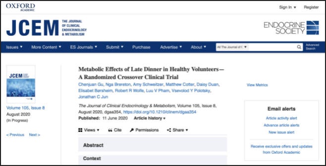 2020年6月《临床内分泌与代谢杂志》(JCEM)上发表了一项研究,该研究选了20名健康志愿者(10名男性和10名女性),平均年龄26岁,平均体重指数23.2,习惯于22:00-01:00就寝,睡眠时间固定。