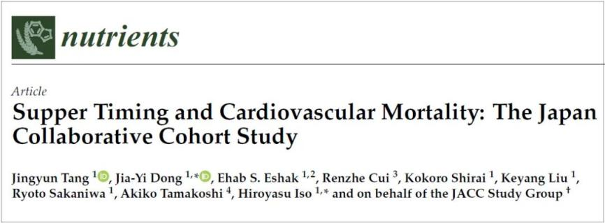 研究人员分析了28625名男性和43213名女性,年龄在40-79岁之间,无心血管疾病和癌症。研究检查了晚餐时间与中风、冠心病和总心血管疾病死亡风险之间的关联。把参与者分为三组: