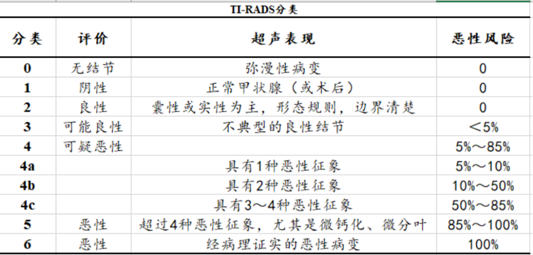 云南省中医医院耳鼻喉科副主任医师刘骥2023年接受春城晚报采访时表示,现有的超声报告一般会对结节进行TI-RADS分类,3类以前的结节恶性概率很低,可默认为良性,只需要常规体检,保持关注;4a类恶性概率也较小,一般建议每3~6个月进行复查再决定是否需要干预;4b类结节及以上的结节因其恶性概率较高,则建议活检或直接手术治疗。