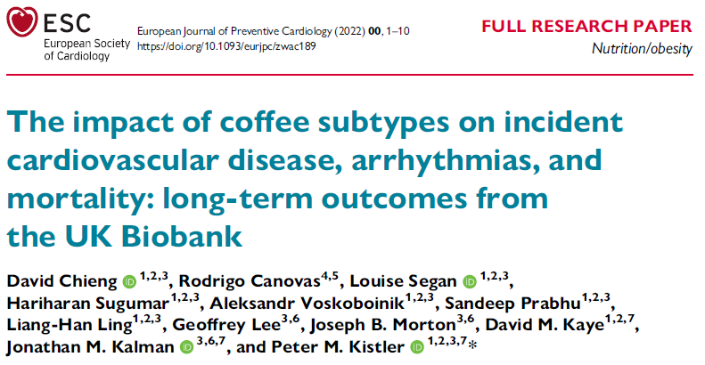 2022年,澳大利亚墨尔本大学的研究人员在《欧洲预防心脏病学杂志》上发表一篇研究。研究发现,与不喝咖啡相比,每天喝2-3杯咖啡,与更长的寿命和更低的心血管疾病风险有关,并且适用于现磨咖啡、速溶咖啡和不含咖啡因的咖啡。