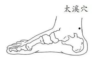 足少阴肾经原穴,在踝后内侧,内踝尖与跟腱之间的凹陷中。