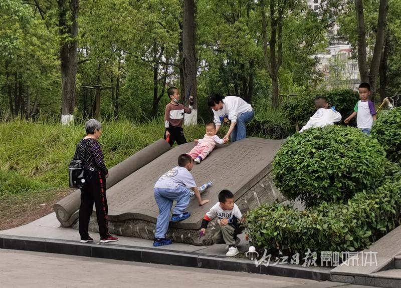 在雕塑处,几名小孩正在攀爬雕塑,在雕塑上随意打闹,而家长也在一旁拍照,并没有加以阻止。“攀爬雕塑既不文明又不安全,大人不仅不阻止,还为小孩拍照,真是不应该。”游客赖女士说道,“我在出游前会教导孩子,一定要文明出游,在出游过程中,我们也会用自身的一些行为去引导、影响孩子。”