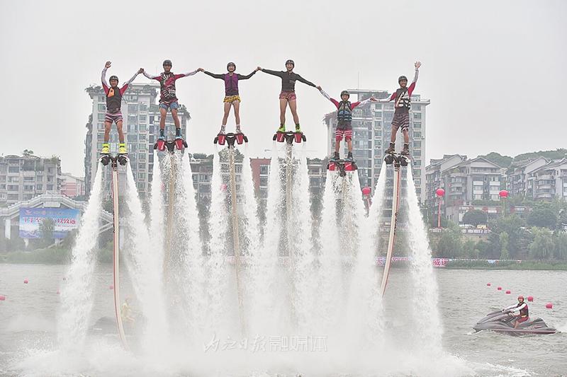 此外,“水上运动+地面舞台”的活动形式,也是内江依托甜城湖资源、做好“水文章”的具体实践。无论是翻、转、跳、跃等滑水表演,还是“众人划桨开大船”的歌舞表演,都体现了内江兴水之利、得水而灵,推动文化旅游体育融合发展,在“甜蜜事业”中扬帆起航的坚定决心。
