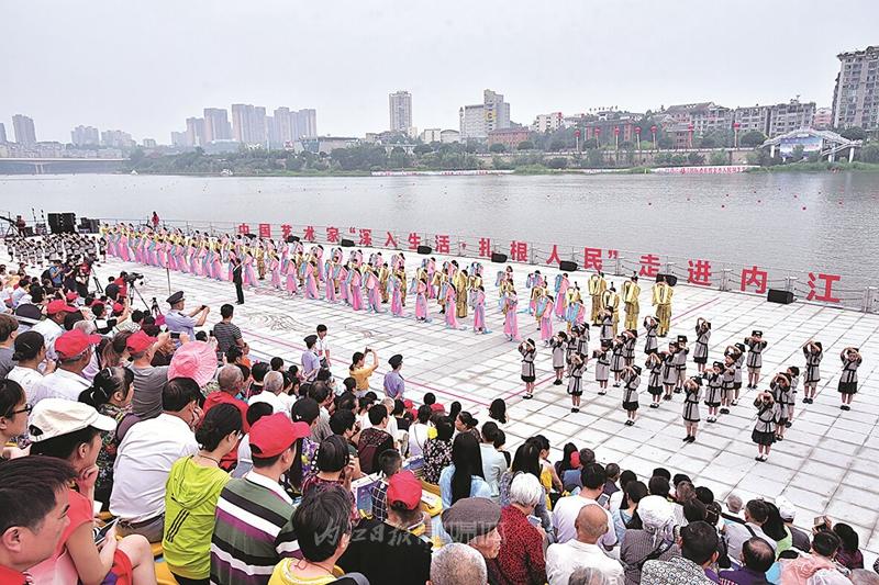 开幕式以天为幕、以地为台、以水为媒、以城为景,设计了一场由“龙腾欢舞颂盛世”“甜都欢歌启新程”“乘风破浪续华章”上、中、下三个篇章组成的演出——10余个文艺节目经过精心编排和打磨,一一展现端午民俗、大千书画和非遗等文化,彰显“大千故里·甜美内江”城市形象。