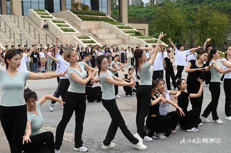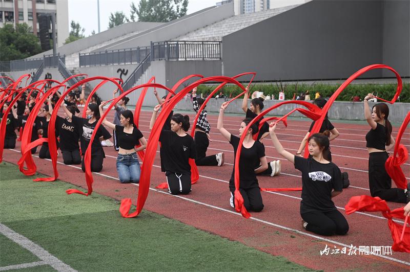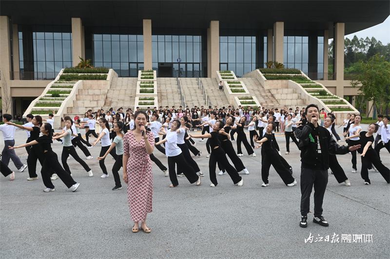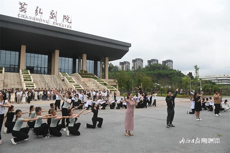 当天上午,在内江师范学院苌弘剧院外,文艺演出舞蹈《大千荷映》和歌舞《向往》的演职人员在编舞老师的指导下,全情投入表演,大家反复打磨动作,努力把最好的效果、最美的风采呈现给观众。