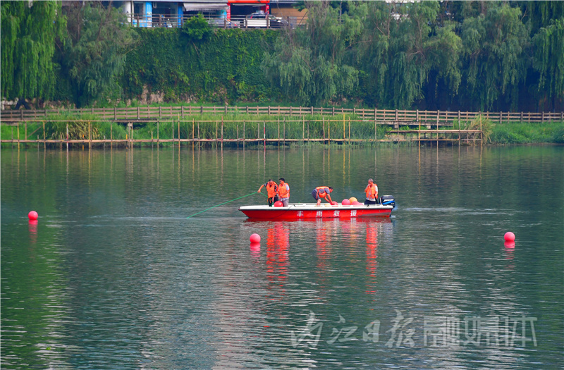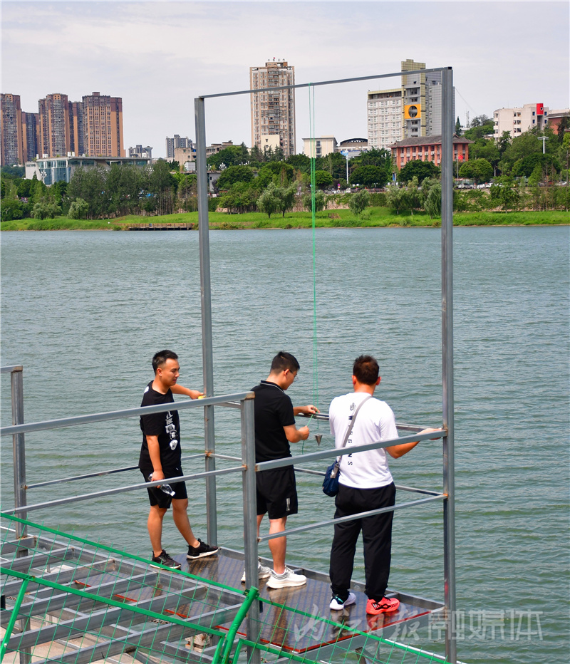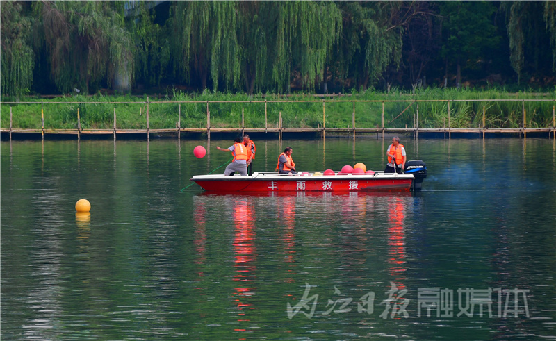上午,记者来到甜城湖,在蓝天白云的映衬下,满江碧水显得格外迷人。甜城湖畔(大洲广场)侧,数名工人正在抓紧施工,进行开幕式主会场的搭建作业;湖中央,几名工人驾驶冲锋舟,正在进行龙舟赛赛道的铺设作业;水面上,已经铺设红、黄相隔的赛道浮球间隔等距……一派忙碌的景象让大赛临近的气氛也紧张起来,不少路过的市民感叹:“龙舟赛快来了!”