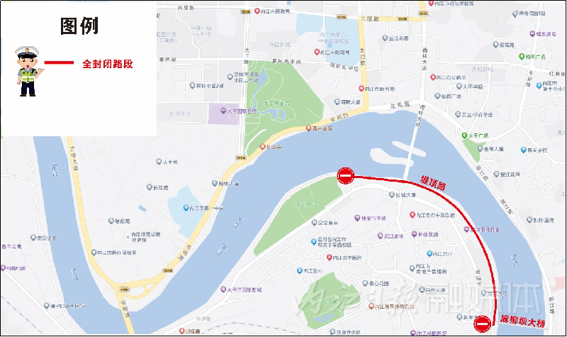 堤顶路:堤顶路(滨江东路)大洲广场至麻柳坝大桥施工围挡段实施全封闭。