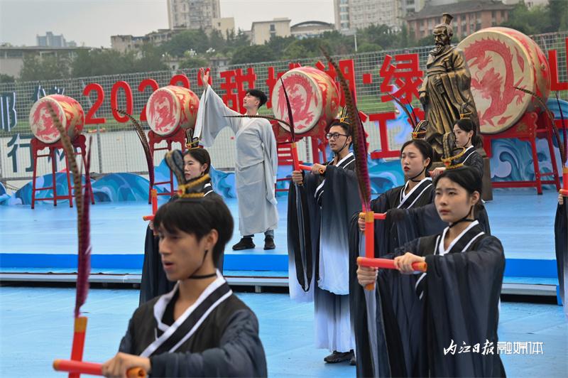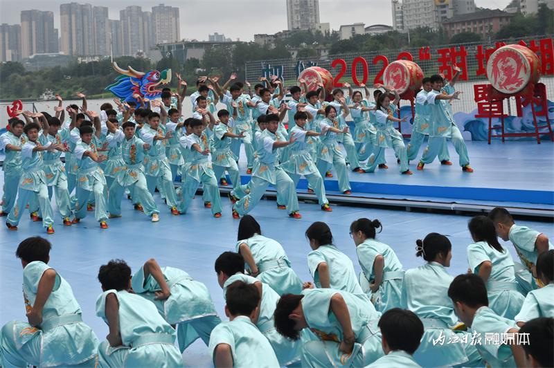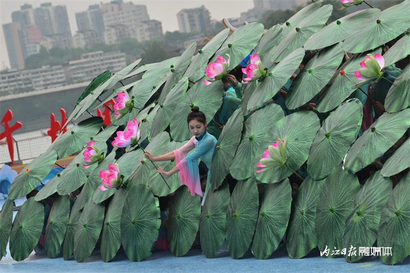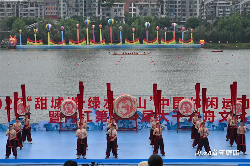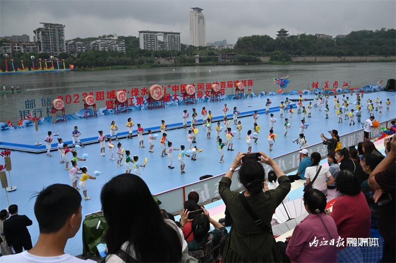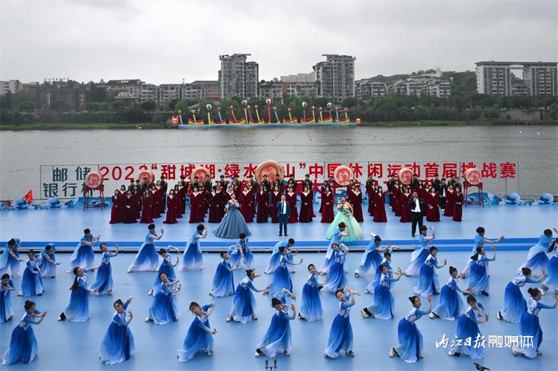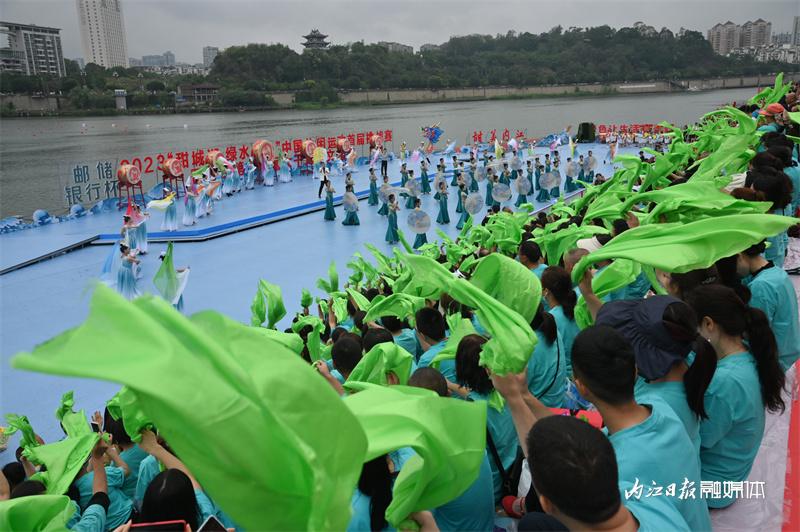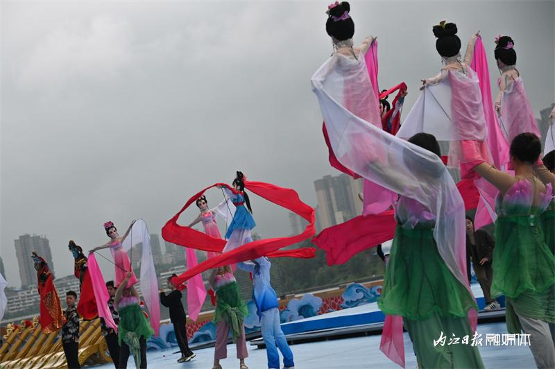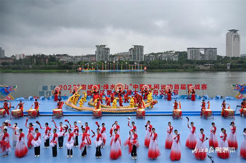 ▲6月16日上午,“邮储银行杯”2023“甜城湖·绿水青山”中国休闲运动首届挑战赛暨内江第十一届大千龙舟文化节开幕式在甜城湖主舞台进行彩排,图为开场表演。