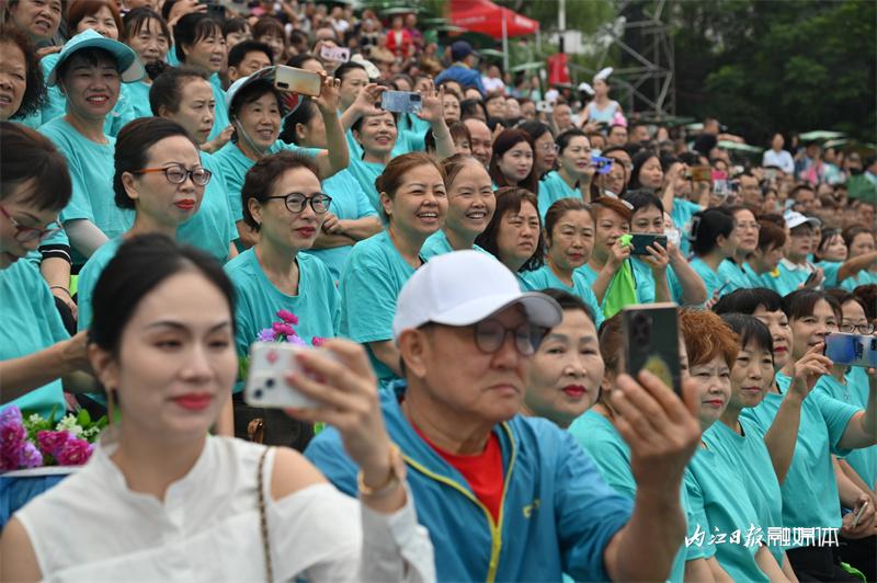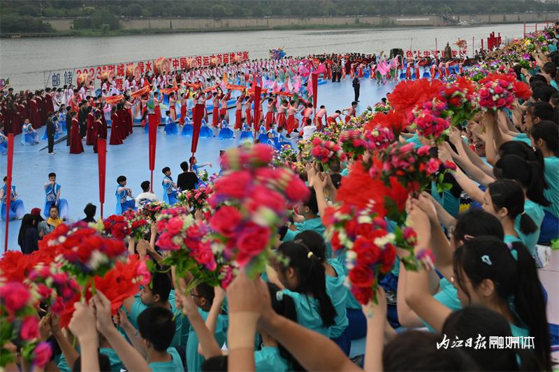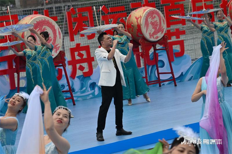 ▲6月16日上午,“邮储银行杯”2023“甜城湖·绿水青山”中国休闲运动首届挑战赛暨内江第十一届大千龙舟文化节开幕式在甜城湖主舞台进行彩排,图为谢幕演出。
