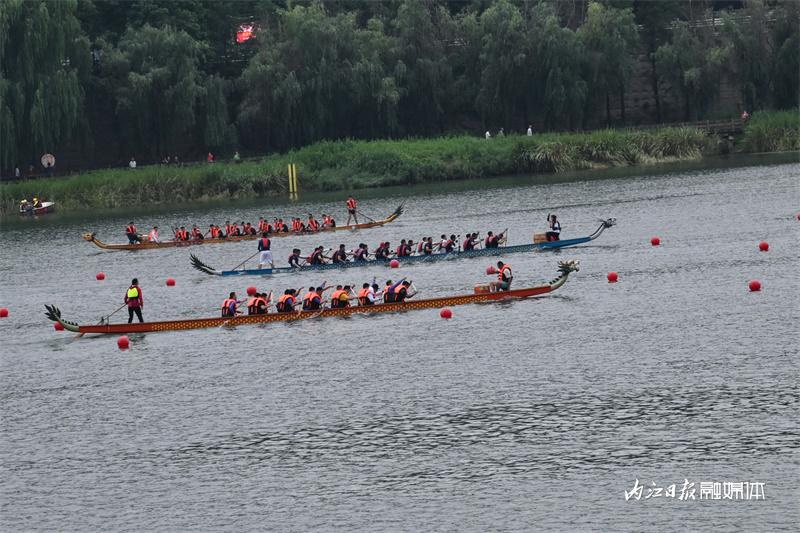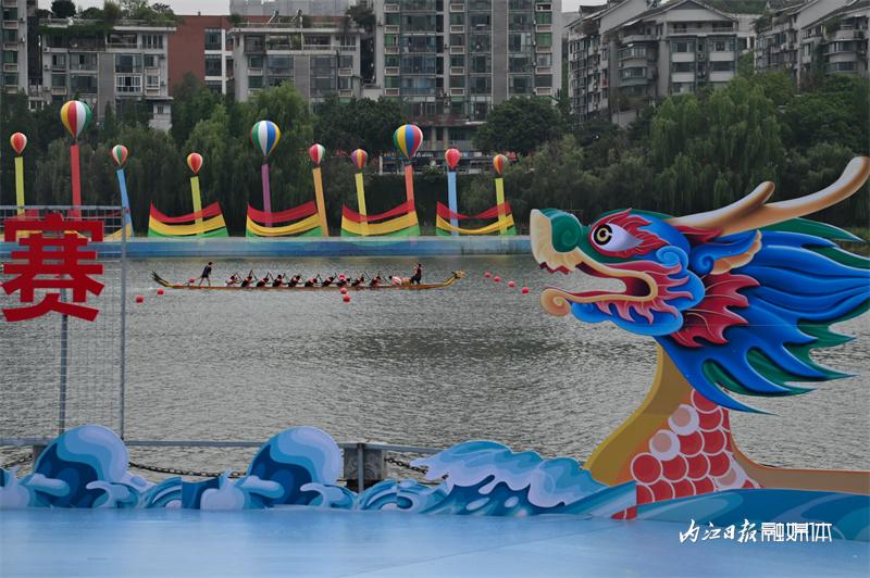 ▲6月16日上午,“邮储银行杯”2023“甜城湖·绿水青山”中国休闲运动首届挑战赛暨内江第十一届大千龙舟文化节开幕式在甜城湖主舞台进行彩排,图为龙舟赛现场。