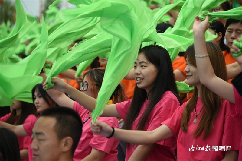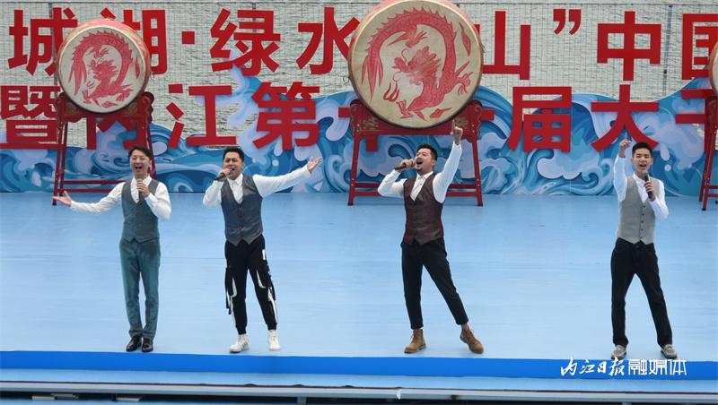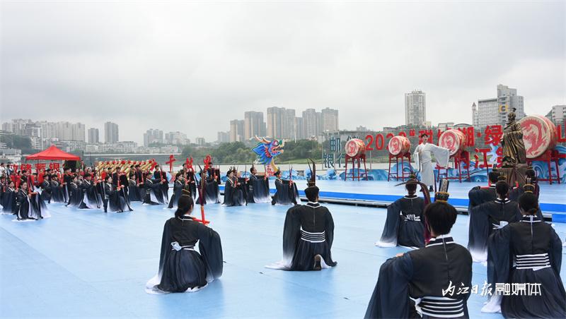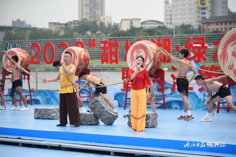 扣人心弦的龙舟赛后,表演进入中篇,诗朗诵《来吧,我在内江等你》、舞蹈《大千荷映》、歌曲联唱《甜都放歌》、音诗舞《礼·魂》上演,一个个充满内江特色的文艺节目,展现出了“文化内江”“甜蜜内江”的风采,让来自四面八方的观众了解内江,爱上“内江甜”。