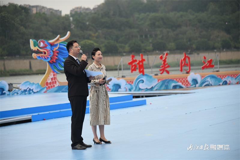 ▲6月16日,2023“甜城湖·绿水青山”中国休闲运动首届挑战赛暨内江第十一届大千龙舟文化节开幕式在活动主舞台彩排,图为活动主持。