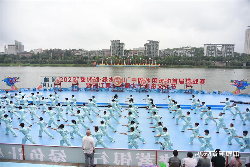 ▲6月16日,2023“甜城湖·绿水青山”中国休闲运动首届挑战赛暨内江第十一届大千龙舟文化节开幕式在活动主舞台彩排,图为《甜都号子》。