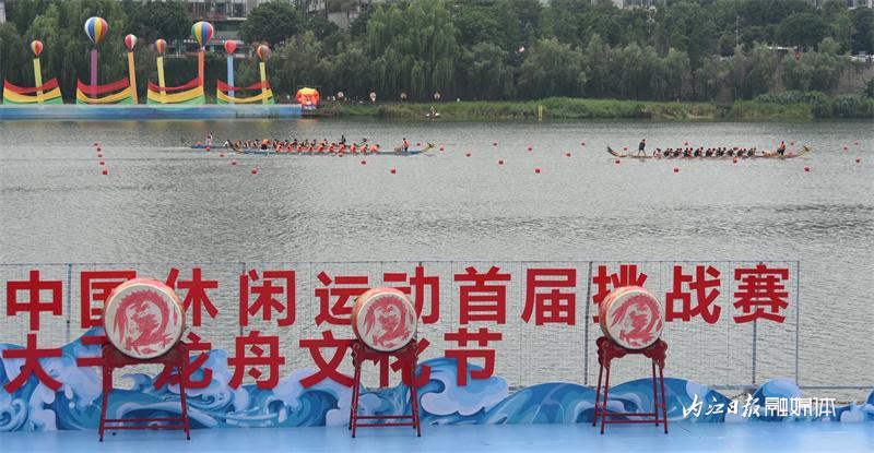 ▲6月16日,2023“甜城湖·绿水青山”中国休闲运动首届挑战赛暨内江第十一届大千龙舟文化节开幕式在活动主舞台彩排,图为龙舟竞渡。