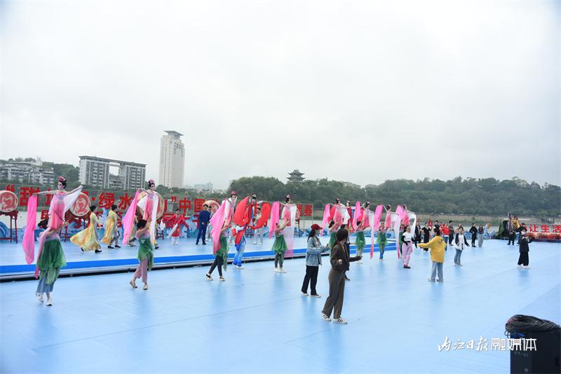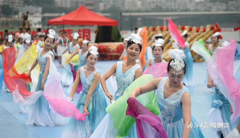 ▲6月16日,2023“甜城湖·绿水青山”中国休闲运动首届挑战赛暨内江第十一届大千龙舟文化节开幕式在活动主舞台彩排,图为舞蹈表演。