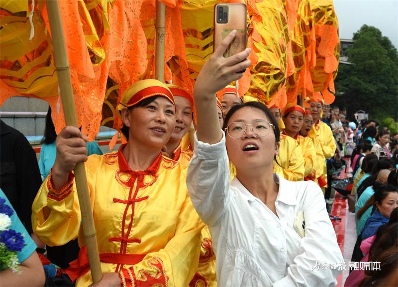 ▲6月16日,2023“甜城湖·绿水青山”中国休闲运动首届挑战赛暨内江第十一届大千龙舟文化节开幕式在活动主舞台彩排,图为演员合影。