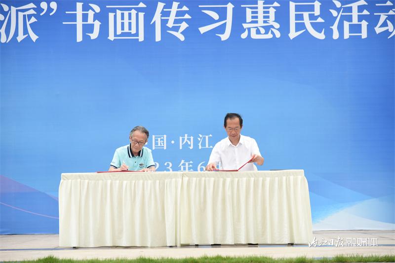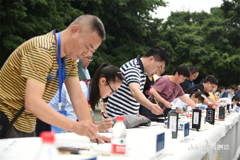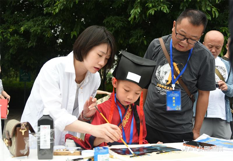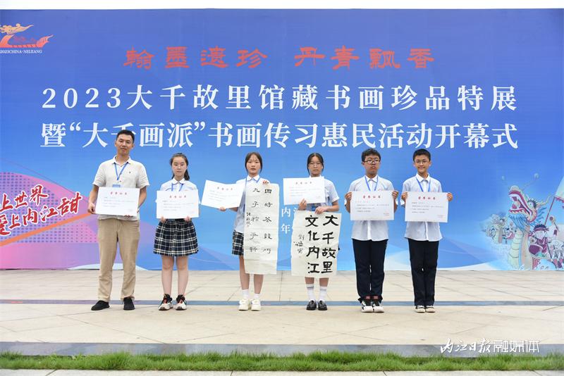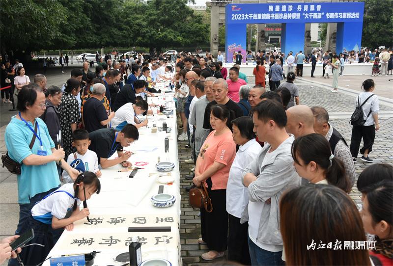 在大千园广场,50名内江书画名家和50名青少年学生代表一一结对,以“传帮带”的形式,现场创作以“甜食之都”“龙舟文化”为主题的书画作品,并通过现场抽奖的方式赠送给市民。