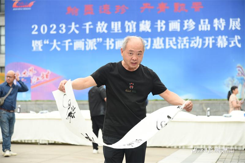 ▲6月17日,翰墨遗珍·丹青飘香——2023大千故里馆藏书画珍品特展暨“大千画派”书画传习惠民活动开幕式在大千园举行。图为喜获墨宝。
