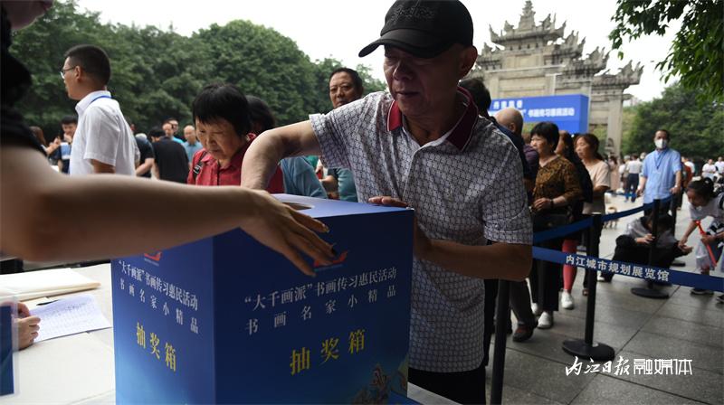 ▲6月17日,翰墨遗珍·丹青飘香——2023大千故里馆藏书画珍品特展暨“大千画派”书画传习惠民活动开幕式在大千园举行。图为抽奖领书画作品。