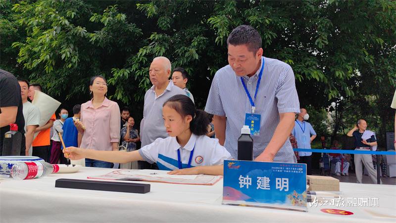 ▲6月17日,翰墨遗珍·丹青飘香——2023大千故里馆藏书画珍品特展暨“大千画派”书画传习惠民活动开幕式在大千园广场举行。图为小小“书法家”。