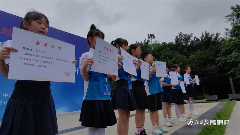 ▲6月17日,翰墨遗珍·丹青飘香——2023大千故里馆藏书画珍品特展暨“大千画派”书画传习惠民活动开幕式在大千园广场举行。图为少年书画爱好者获得荣誉证书。