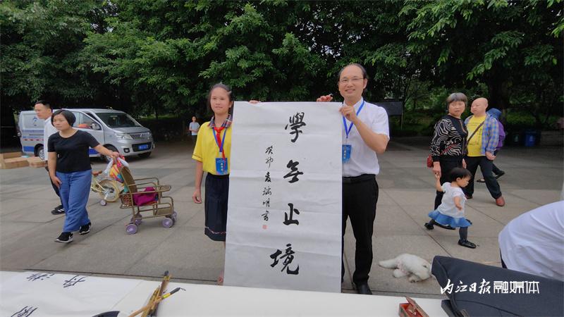 当天,50位书画家和50名来自内江市高校、中小学校的书画爱好者现场进行书画创作,并将作品赠送给100名市民。他们挥毫泼墨、笔走龙蛇,让书画爱好者见证了书画的“高光时刻”。