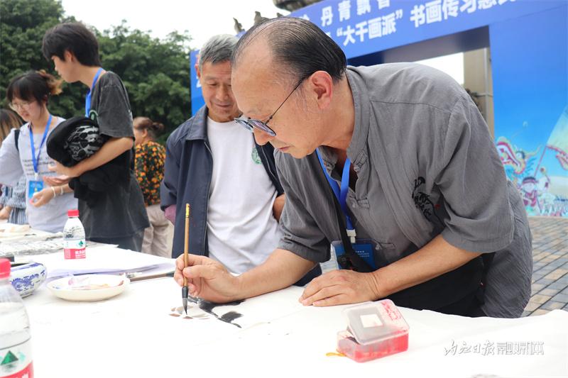 ▲6月17日,翰墨遗珍·丹青飘香——2023大千故里馆藏书画珍品特展暨“大千画派”书画传习惠民活动开幕式在大千园广场举行。图为画家现场作画。