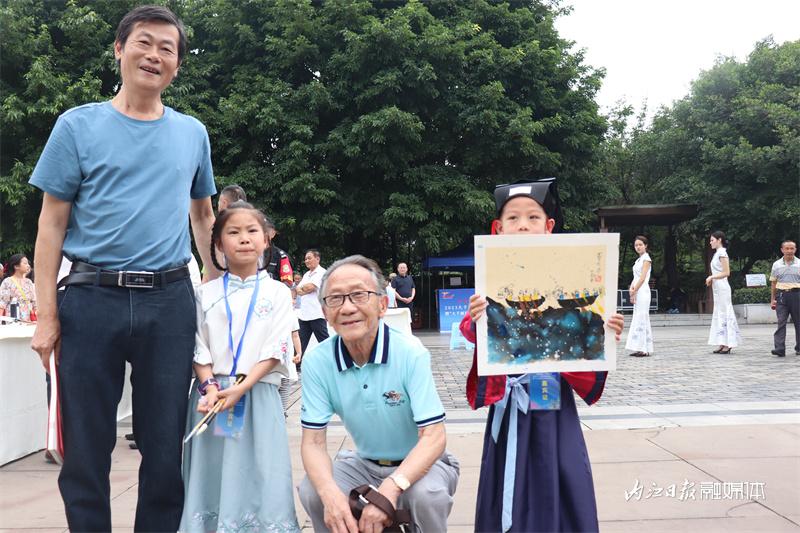 ▲6月17日,翰墨遗珍·丹青飘香——2023大千故里馆藏书画珍品特展暨“大千画派”书画传习惠民活动开幕式在大千园广场举行。图为小书画爱好者获赠书法作品。