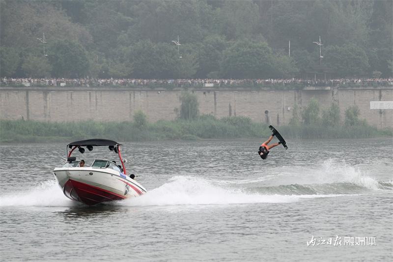 花式摩托艇舰队则表演了“针锋相对”“蛟龙入海”“争分夺秒”等特技动作,国家滑水队运动员段振坤为观众带来了水上飞人表演秀,展示尾波滑水的高超技艺。据了解,段振坤是内江籍优秀运动员,有着“我国第一个水上女子飞人”之称,2011年打破尾波滑水世界吉尼斯纪录。