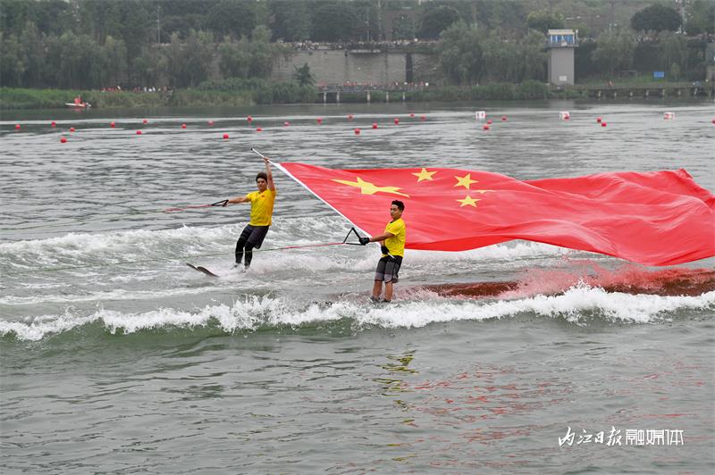 ▲6月18日,运动员手持巨幅国旗进行水上滑水表演。