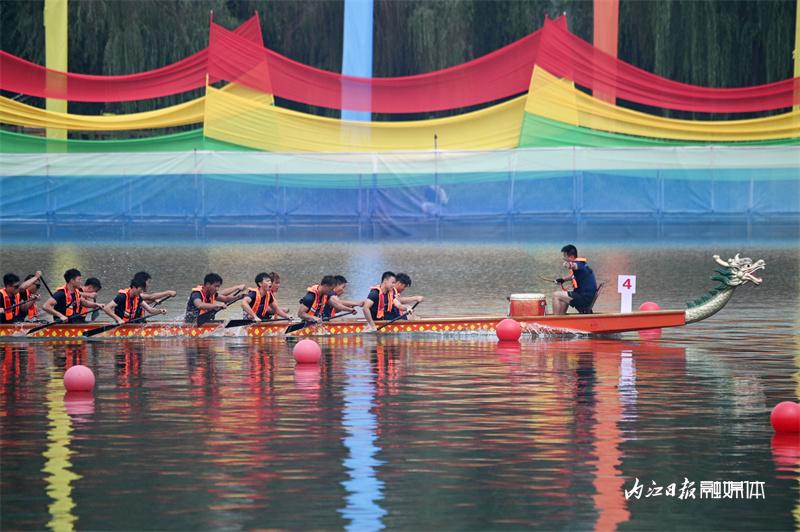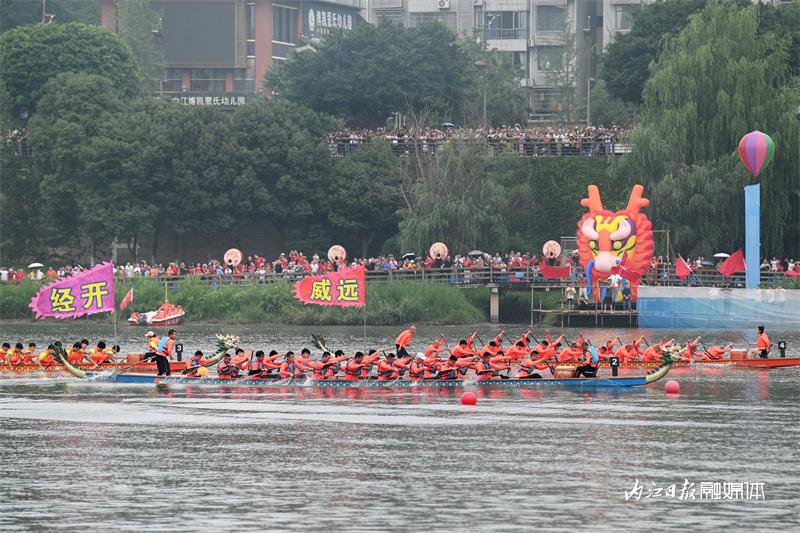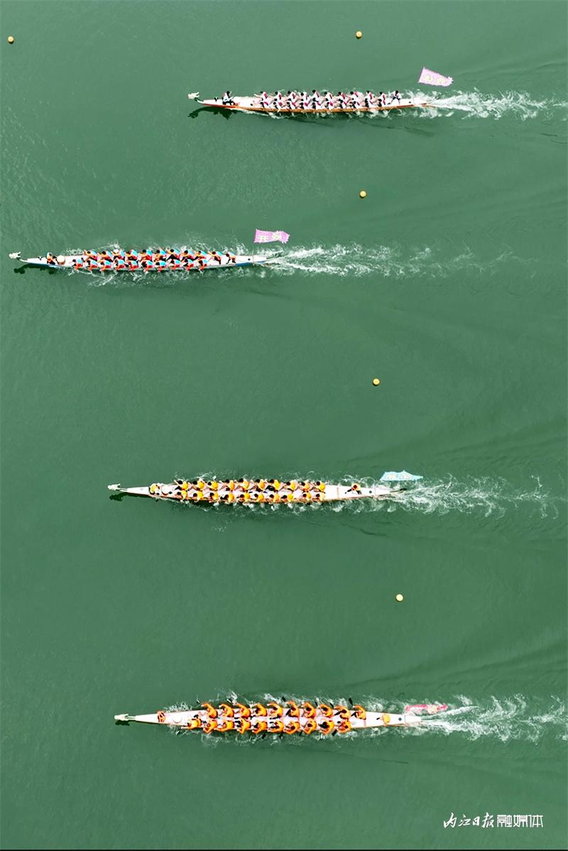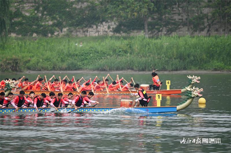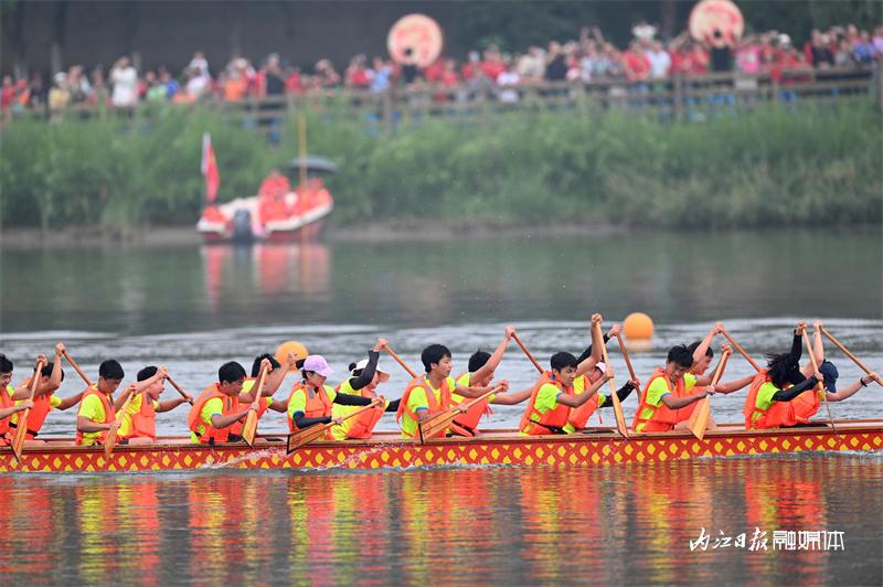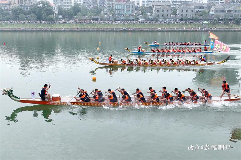 “加油!加油!加油!”文艺表演间隙,随着发令枪响,参加500米直道竞速赛的16支龙舟队分成4组,展开激烈角逐。鼓点愈密,桨声愈急,龙舟如离弦的箭一样冲向终点。甜城湖两岸,上万名观众的加油声、喝彩声、欢呼声此起彼伏,一浪高过一浪。