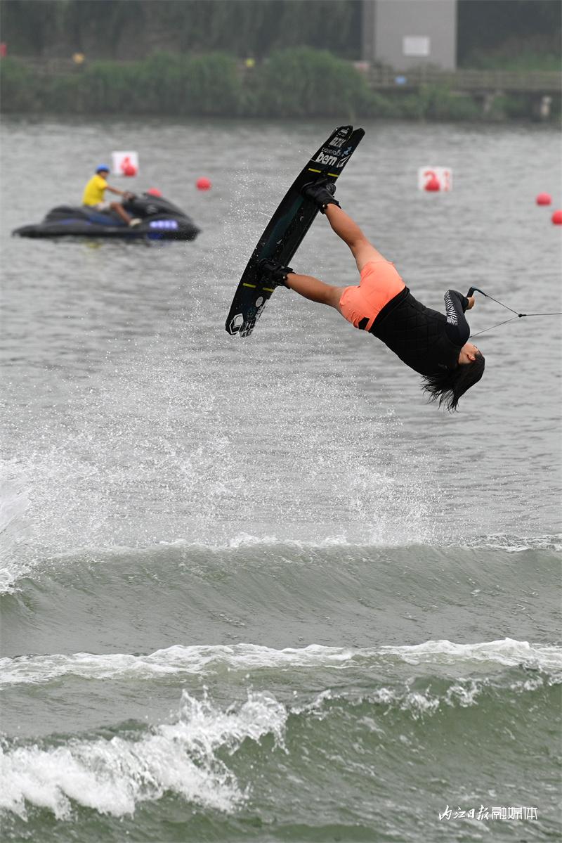 ▲6月18日,运动员驾驶立式水上摩托艇进行特技展示。