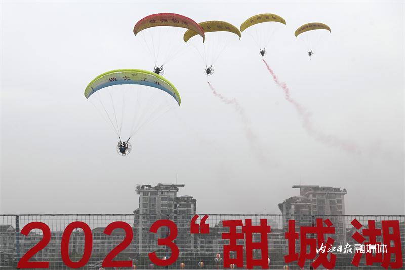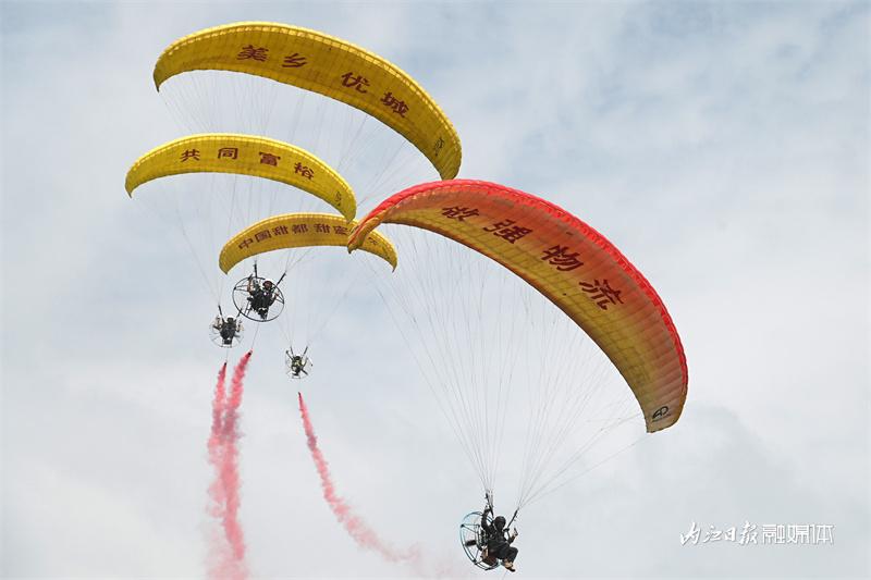 暖场表演阶段,动力伞纵队进入主场区成梯行编队,然后再分散绕城飞行。动力伞上,“做大工业、做强物流、美乡优城、共同富裕”“中国甜都·甜蜜端午”等字样在空中飘飞,烘托了浓浓的节日气氛。