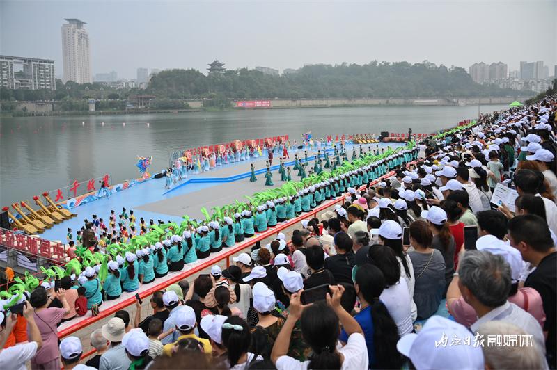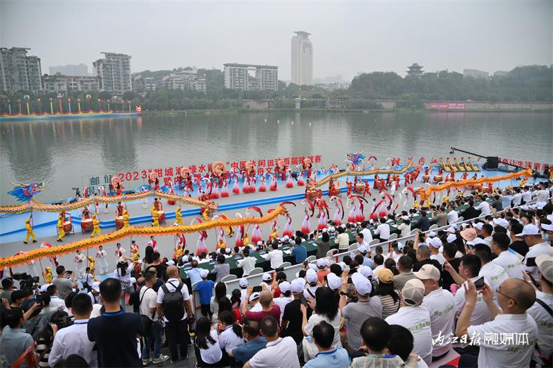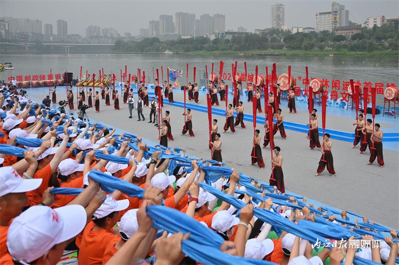 ▲6月18日,“邮储银行杯”2023“甜城湖·绿水青山”中国休闲运动首届挑战赛暨内江第十一届大千龙舟文化节开幕式在甜城湖举行。图为《赛龙舟》节目现场。
