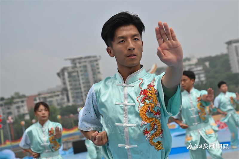 ▲6月18日,“邮储银行杯”2023“甜城湖·绿水青山”中国休闲运动首届挑战赛暨内江第十一届大千龙舟文化节开幕式在甜城湖举行。图为《大千武魂》节目现场。