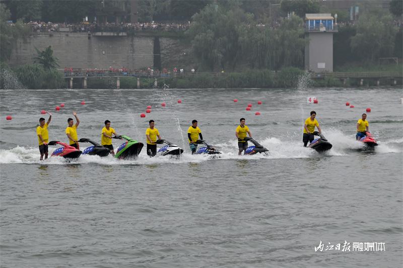 ▲6月18日,“邮储银行杯”2023“甜城湖·绿水青山”中国休闲运动首届挑战赛暨内江第十一届大千龙舟文化节开幕式在甜城湖举行。图为摩托艇表演。