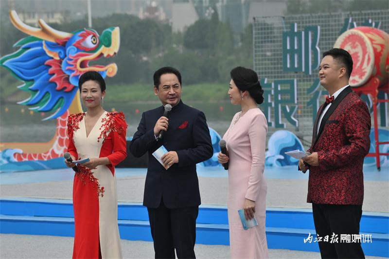 ▲6月18日,“邮储银行杯”2023“甜城湖·绿水青山”中国休闲运动首届挑战赛暨内江第十一届大千龙舟文化节开幕式在甜城湖举行。图为主持开场。