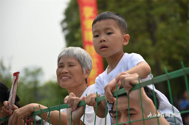 ▲6月18日,“邮储银行杯”2023“甜城湖·绿水青山”中国休闲运动首届挑战赛暨内江第十一届大千龙舟文化节开幕式在甜城湖举行。图为老少市民观看节目表演。