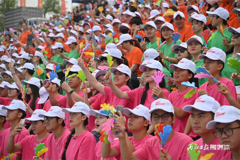 ▲6月18日,“邮储银行杯”2023“甜城湖·绿水青山”中国休闲运动首届挑战赛暨内江第十一届大千龙舟文化节开幕式在甜城湖举行。图为《来吧,我在内江等你》节目现场。