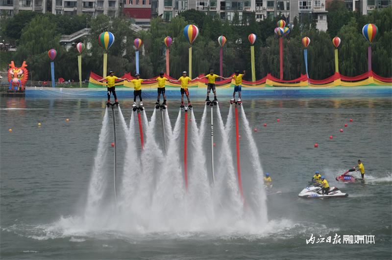 ▲6月18日,“邮储银行杯”2023“甜城湖·绿水青山”中国休闲运动首届挑战赛暨内江第十一届大千龙舟文化节开幕式在甜城湖举行。图为水上运动表演。