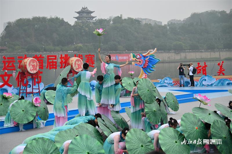 ▲6月18日,“邮储银行杯”2023“甜城湖·绿水青山”中国休闲运动首届挑战赛暨内江第十一届大千龙舟文化节开幕式在甜城湖举行。图为《大千荷映》节目现场。