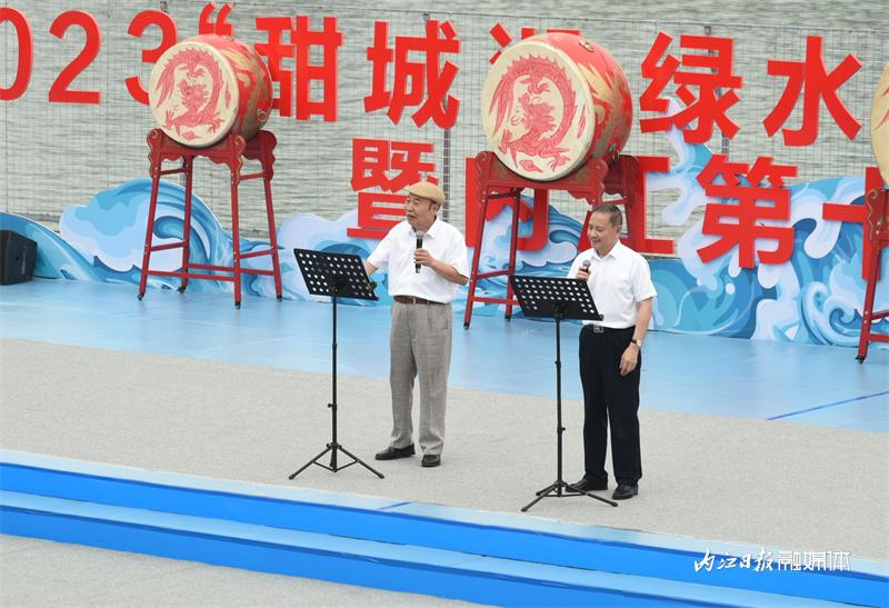 ▲6月18日,“邮储银行杯”2023“甜城湖·绿水青山”中国休闲运动首届挑战赛暨内江第十一届大千龙舟文化节在大洲广场主舞台举行,图为主持阵容。